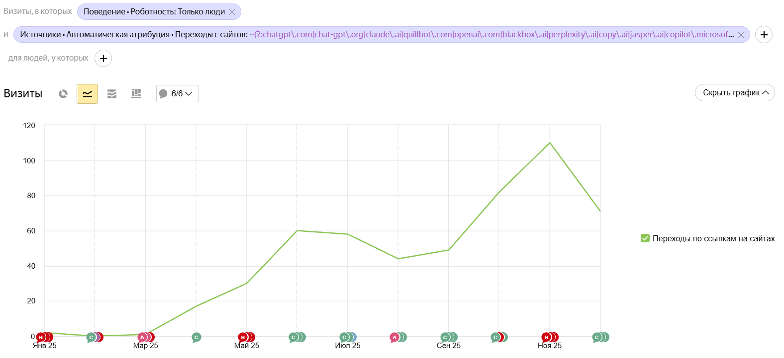 • Годовой рост переходов: +3450% (с 2 до 71 визита).