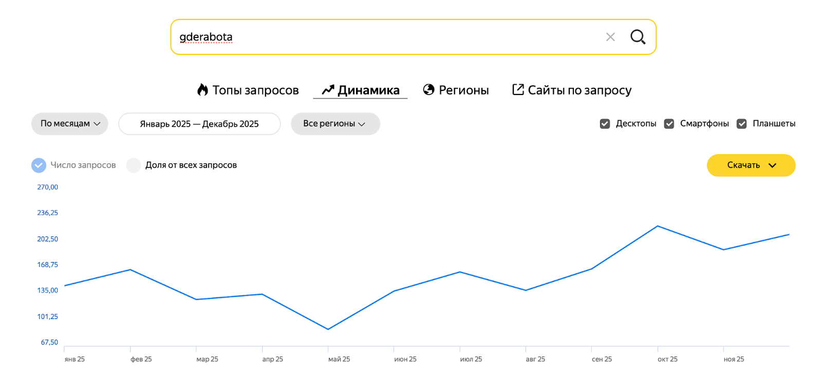 Однако влияние выходит за рамки цифр в отчетах. Мы и сами часто проверяем, как голосовые помощники отвечают на тематические запросы, и видим, что ситуация к концу года кардинально улучшилась. Если в начале года Алиса практически не знала о нас и не предлагала в ответ на релевантные вопросы, то сейчас на запрос «Алиса, где бесплатно разместить вакансию» она называет наш сайт первым. Правда, пока странно его читает – ГджеРабота, но мы попробуем поработать над этим.