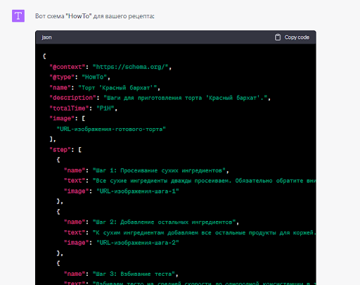 В случае с микроразметкой HowTo можно ввести аналогичный текстовый запрос, как мы делали для FAQ, ChatGPT выполнит 99% работы. Промпт будет выглядеть так: «Создай HowTo-схему по приготовлению торта по шагам ниже и предложи изображения к каждому шагу».