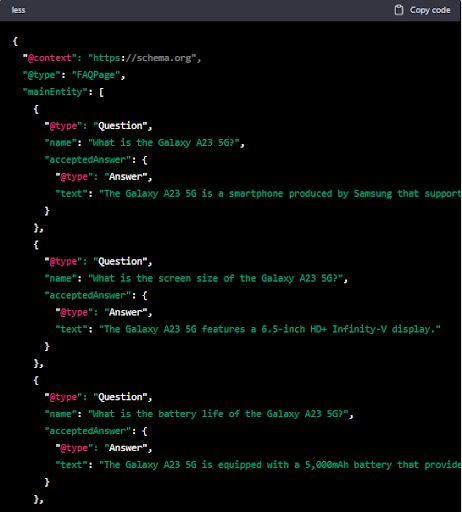 Пример запроса: «Напиши 5 часто задаваемых вопросов для Galaxy A23 5G с ответами».