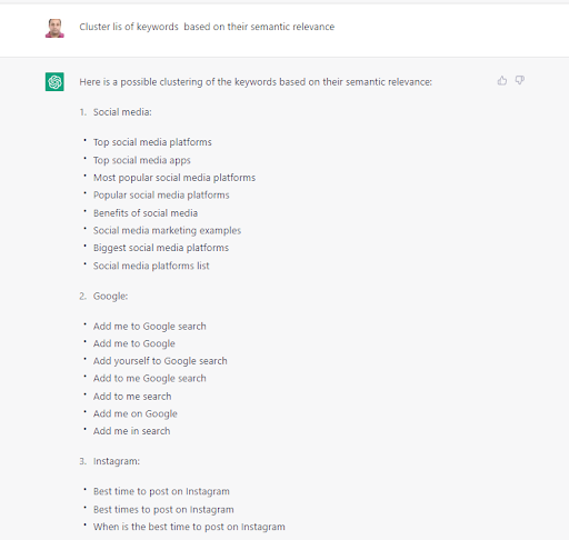 С помощью ChatGPT можно группировать в кластеры ключевые слова, по которым вы занимаете позиции в результатах поиска. Для этого составьте список ключей на основе их семантической релевантности.