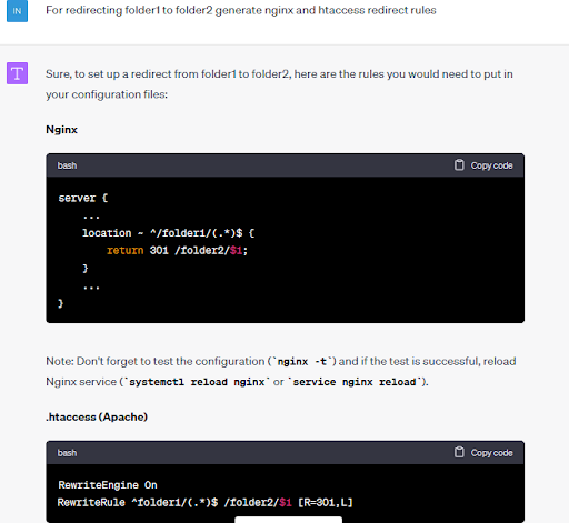 В качестве промпта мы использовали следующую фразу: «Напиши мне правила для написания инструкций для редиректа 301 с folder1 на folder2 для Nginx и htaccess». Получили результаты, которые полностью подошли для наших задач: