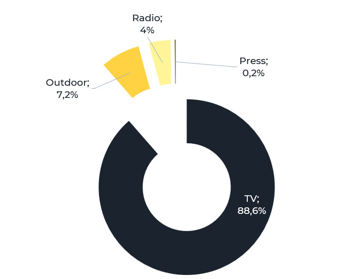 Основная битва за внимание покупателя разворачивается на ТВ, которое забирает 88,6% всех рекламных бюджетов. Доля наружной рекламы также увеличилась и достигла 7,2%, тогда как на радио идет сокращение бюджета, оно занимает 4%.