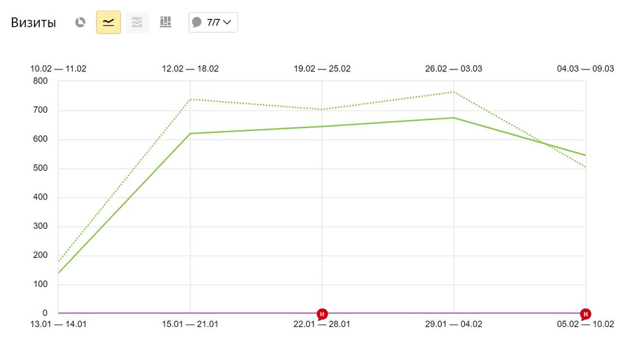 До начала продвижения они привлекали из органической выдачи Яндекса по 600 посетителей в месяц. На второй месяц со старта работ это число выросло до 700+.