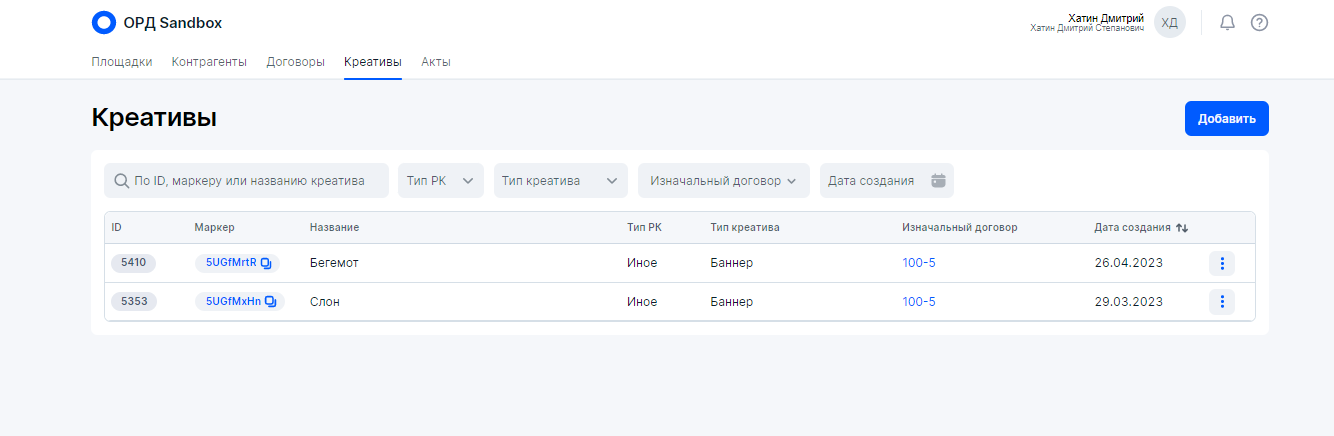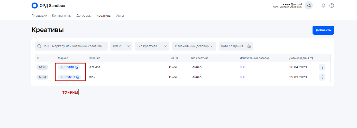 6. Оформить креативы и получить токены для непосредственной маркировки. Допустим, Рекламодатель размещает на интернет-площадке Блогера два баннера Слон и Бегемот в марте 2023 года. Вместо этого могут быть иные рекламные материалы, например два поста в соцсетях блогера в марте 2023 года.