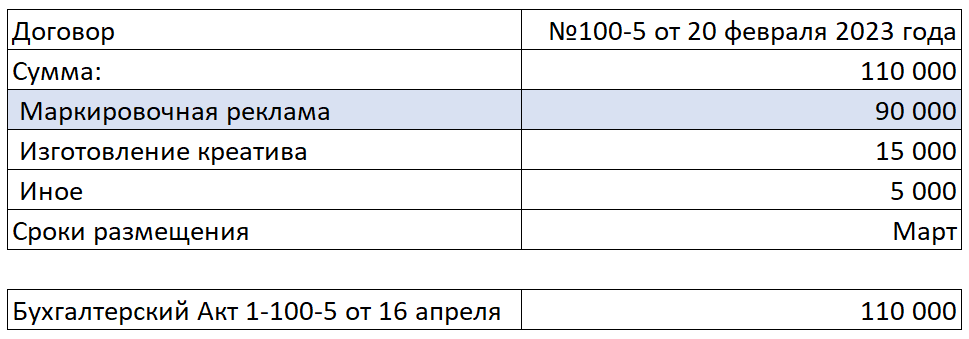 Внимание: разаллокация по изначальному договору 100-3 между Рекламодателем и Рекламным агентством с суммой 90 000 рублей (именно она была потрачена на маркировочную рекламу)