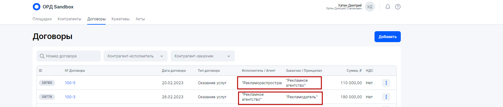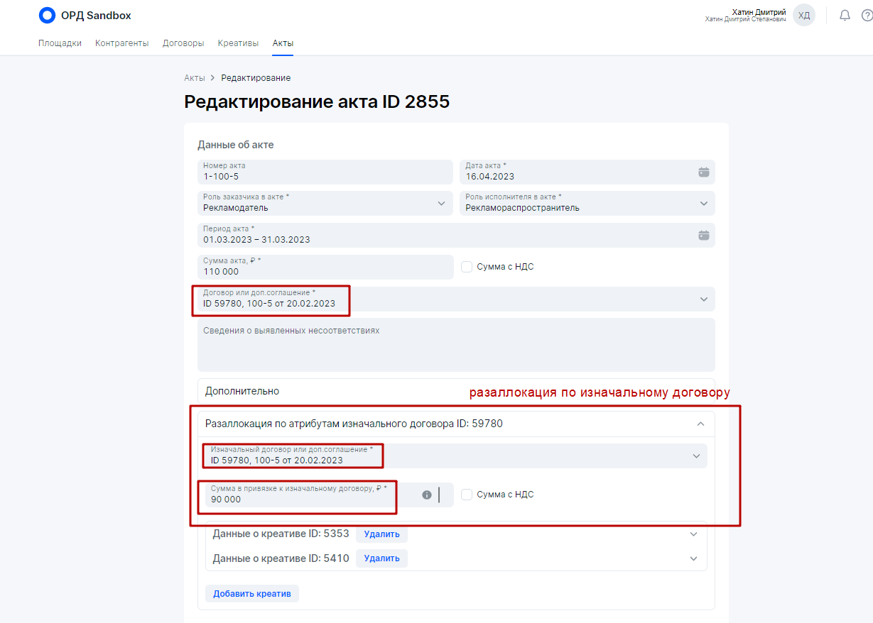 Отметим, что при оформлении своей отчетности, агентство также ранее указало в ОРД свой договор с исходным Рекламодателем — договор 100-3 (в нашем случае это и будет Изначальным договором для разаллокации в Актах):