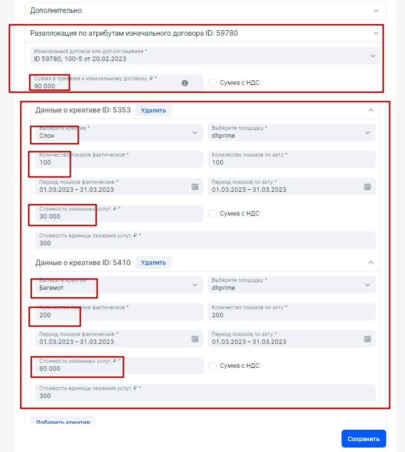 Далее в Актах идет блок для разаллокации в разрезе креативов и Изначального договора. Как было указано выше, в нашем случае изначальный договор и договор Рекламодатель-Блогер это одно и то же. Сумма должна быть указана ТОЛЬКО за маркировочную рекламу — 90 000 рублей.