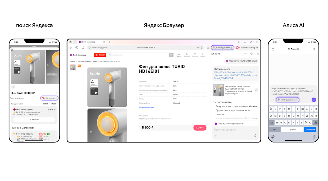 Для поиска выгодных предложений с помощью ИИ покупатель может отправить ссылку на товар в приложении Алиса AI, веб-версии чата с нейросетью или приложении Яндекс с Алисой AI. Находить товары по выгодным ценам также можно на ПК в Браузере: достаточно открыть интернет-страницу с товаром, и кнопка «Найти дешевле» появится рядом с адресной строкой. Обратиться к ИИ пользователи могут и в Поиске – по кнопке «Найти скидку» в карточке товара.