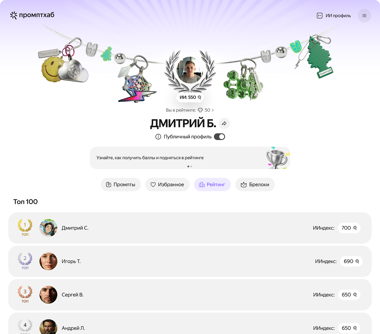 ИИндекс есть у каждого пользователя Яндекса: он показывает, насколько активно человек осваивает нейросети. ИИндекс и рейтинг превращают промптинг в увлекательное занятие, чтобы как можно больше людей научились решать свои задачи с помощью нейросетей. Для того чтобы повысить ИИндекс и место в рейтинге, нужно чаще обращаться к Алисе AI, добавлять на Промптхаб свои идеи и собирать лайки, тестировать промпты других авторов, участвовать в челленджах и проходить курсы по работе с ИИ. В топе лидеров рейтинга окажутся самые любознательные – те, кто находит новые способы применения ИИ в жизни.