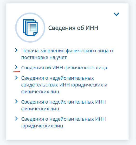 Чтобы узнать ИНН онлайн по паспорту через портал Федеральной налоговой службы, нужно перейти в раздел «Сервисы и госуслуги», а там – выбрать пункт «Сведения об ИНН физического лица»:
