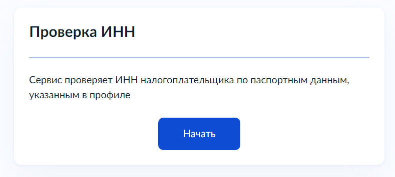 Также можно найти эту услугу в разделе ФНС – называется «Проверка ИНН», найти ее можно по ссылке. Работает очень просто, нужно нажать на «Начать»: