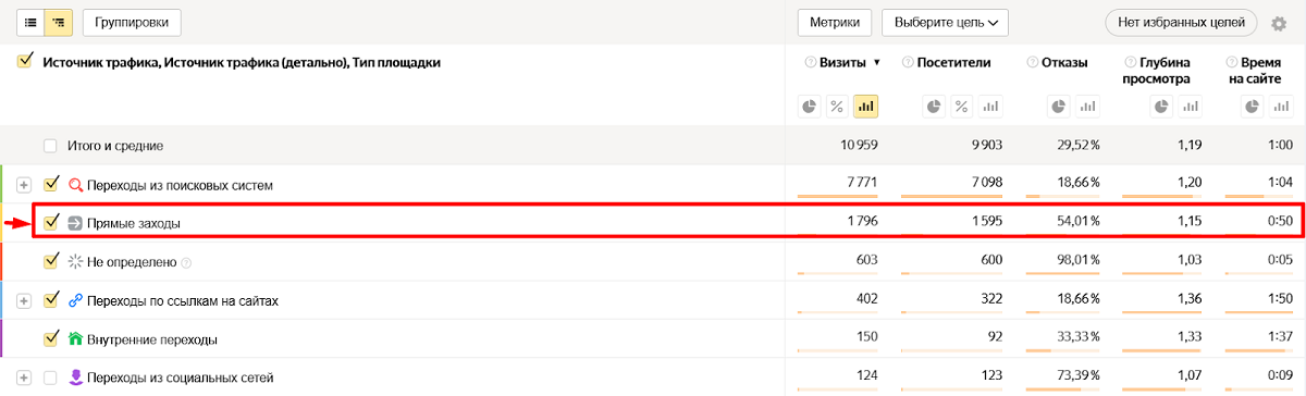 В таблице отображаются все каналы трафика. Выберите строку «Прямые заходы» и система покажет показатели именно по этому источнику.