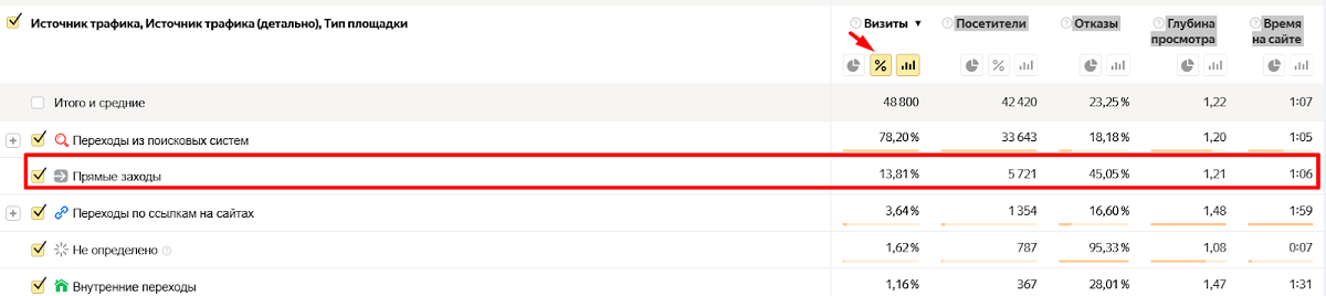 Как сделать: переведите показатель «Визиты» в процентный формат в отчете «Источники, сводка». Например, прямые заходы составляют 5%, 20% или треть всех переходов.