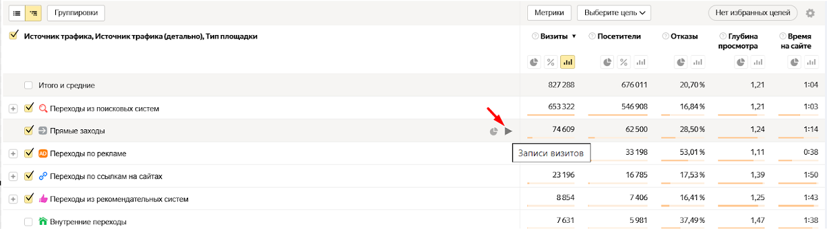 Как открыть записи: в отчете «Источники, сводка» наведите курсор на «Прямые заходы» и нажмите «Записи визитов». Вы увидите:
