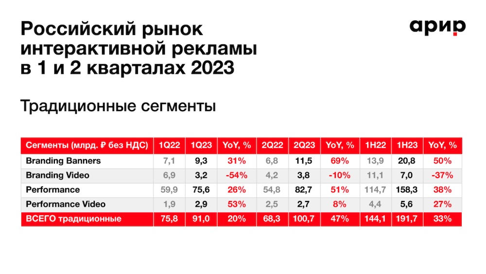Эксперты АРИР подсчитали объемы традиционных сегментов рынка интернет-рекламы. В период с января по июнь 2023 года инвестиции составили 191,7 млрд рублей. Это на 33% больше, чем в аналогичном периоде прошлого года.