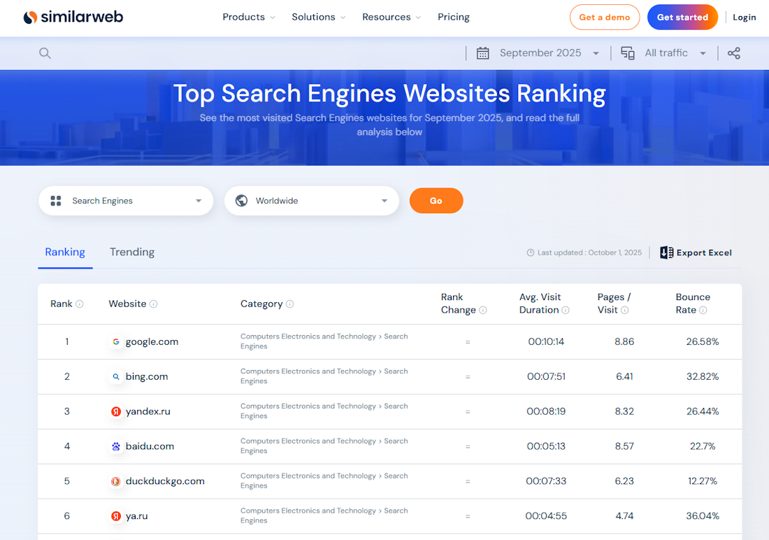 Посмотреть статистику в других странах можно на сайте SimilarWeb. Здесь отображается рейтинг поисковиков во всем мире, есть сортировка по странам и устройствам. Платформа собирает и другую статистику: можно узнать рейтинг браузеров, приложений и сайтов. Эти данные полезны для SEO-аналитики и оценки конкурентной среды.