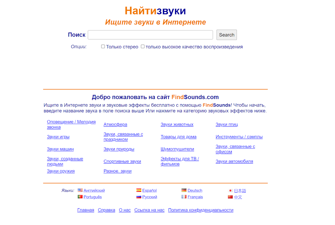 В FindSounds можно искать разные звуки, например, пение птиц, гул офиса, кипение воды, звучание музыкальных инструментов и т. д. В результатах выводится несколько вариантов звука с возможностью прослушать его и скачать. Русскоязычные запросы поисковик не понимает, но можно искать на английском или использовать готовые категории звуков (поддерживают русский). FindSounds будет полезен музыкантам, видеоблогерам, подкастерам.