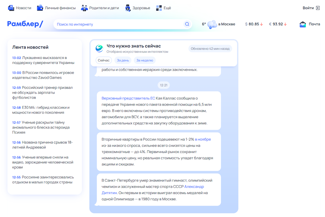 Рамблер – это не только поиск, но и медийный портал. На главной сайта доступны новости и развлекательные материалы.