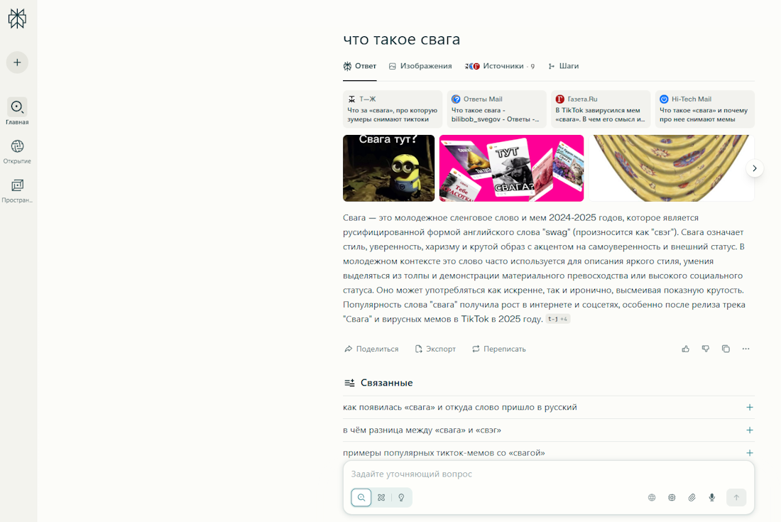 Персонализированные ответы. Система учитывает прошлые запросы, интересы и местонахождение пользователя, повышая релевантность выдачи.