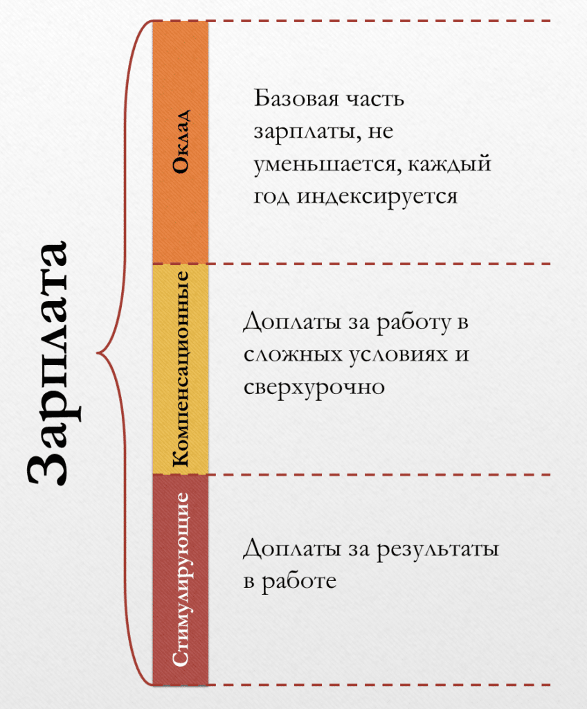 - Фиксированная часть – оклад. Она должна составлять примерно 60% от зарплаты, хотя это требование выполняется не везде и не всегда. Эта сумма ежегодно индексируется и к ней привязываются другие выплаты.