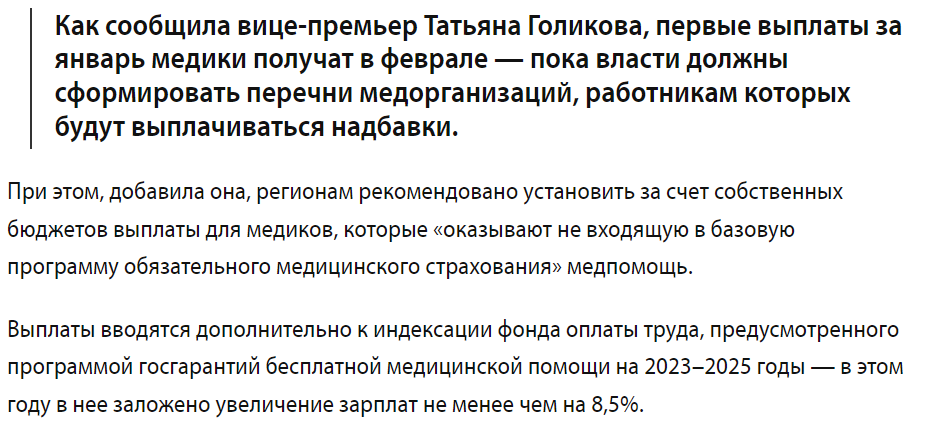 Чуть позже Татьяна Голикова сообщила, что первые выплаты начнут поступать медикам уже с февраля 2023 года, когда будут готовы списко медорганизаций и сотрудников.