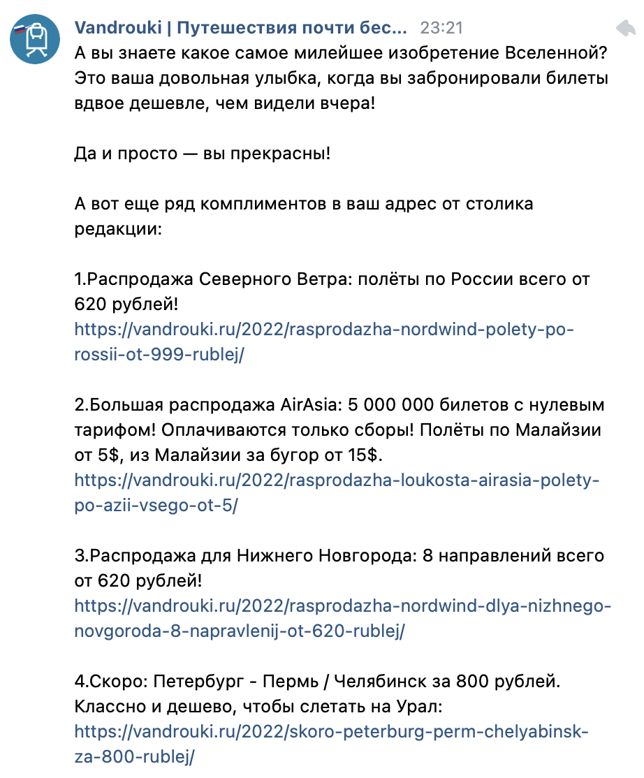 Сервис путешествий собрал информацию об акциях на ЖД и авиабилеты, и преподносит подписчикам в удобном формате.