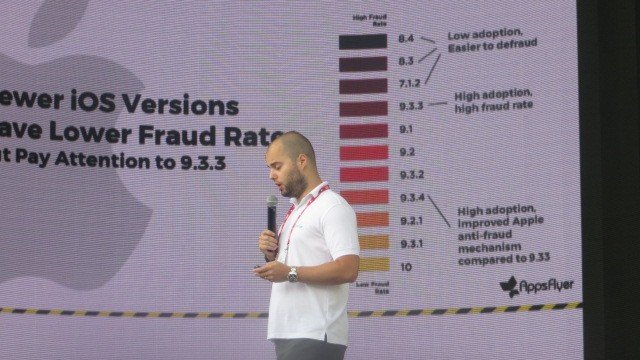 Понравилось, что прежде чем представить новое решение от AppsFlyer в области защиты от фрода, спикер уделил достаточное внимание проблеме в целом, сообщив некоторые интересные факты и цифры. Так, например, знали ли вы, что приблизительная цифра потерь, связанных непосредственно с самим мобильным фродом и с его последствиями, которые несут рекламодатели и издатели, составляет 350 млн. долларов? А о том, что мошенники локализуются там, где облегчен доступ к выплатам? Сегодня в первых рядах это Китай, по сравнению с которым рынок США можно считать вполне безопасным, ведь там уже давно и активно используются средства для борьбы и защиты от фрода. В Японии также на этот счет довольно чисто. Всем компаниям, желающим нацелиться на другую территорию, обязательно нужно учитывать, что в разных странах — разная степень мошенничества.