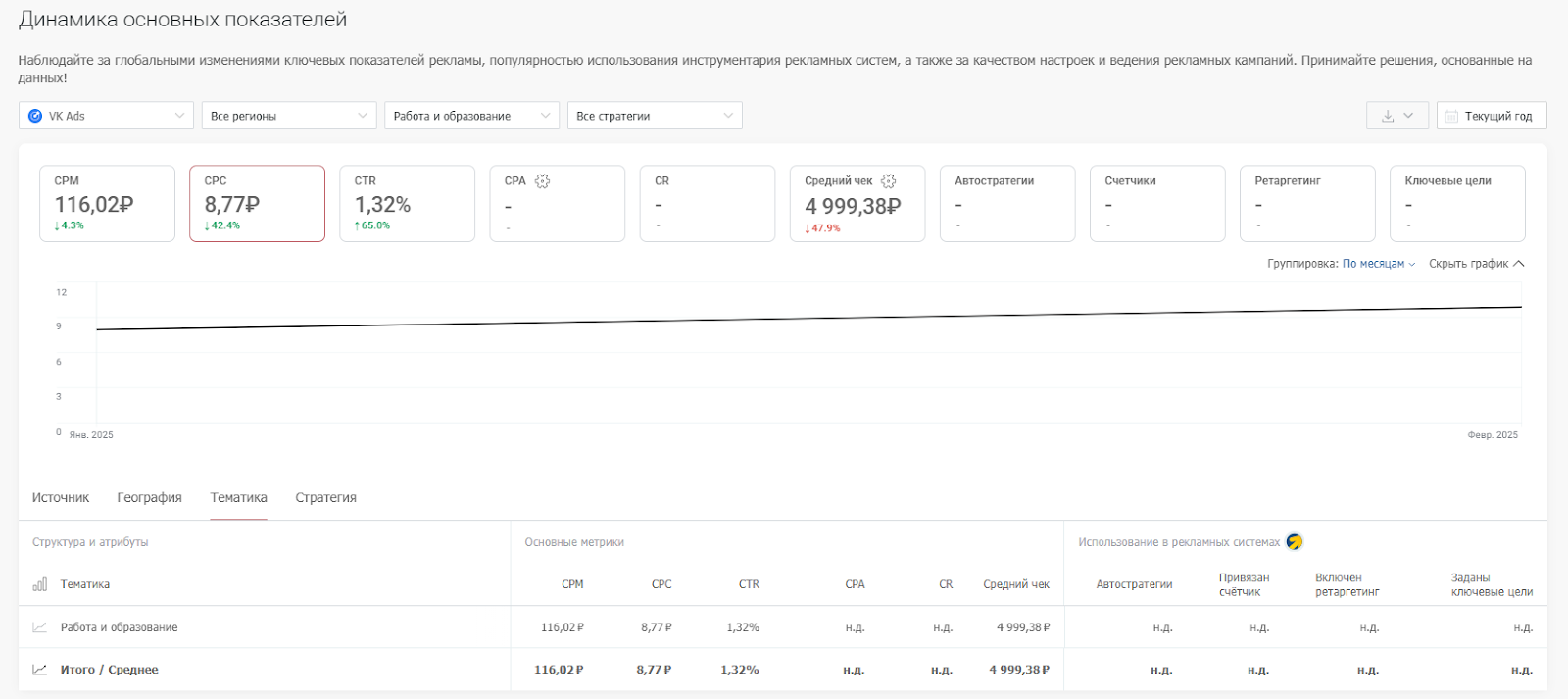 На цены влияет тематика бизнеса. Собрали усредненные данные из «Пульса» click.ru за 2025 год. «Пульс» – инструмент с обезличенными данными тысяч рекламодателей. Статистика считается практически в режиме реального времени. В сервисе можно узнать CPC, CTR, CPM, CPA, CR за любой отрезок времени.
