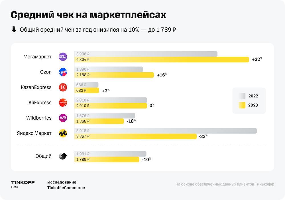 Несмотря на рост числа танзакций, средний чек снизился на 10% — до 1789 рублей. Однако, на некоторых площадках (Мегамаркет, Ozon, KazanExpress) он вырос. Самый высокий средний чек (4804 рубля) был у пользователей Мегамаркета. Самый низкий (683 рубля) — на KazanExpress.