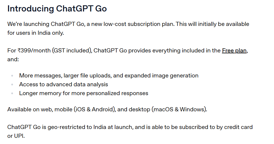 Новая подписка рассчитана на пользователей, для которых тариф уровня Plus был слишком дорогим. В компании сообщили, что сначала запустят ChatGPT Go в Индии, оценят обратную связь, по итогом которой будет решено, появится ли подобная подписка в других странах.