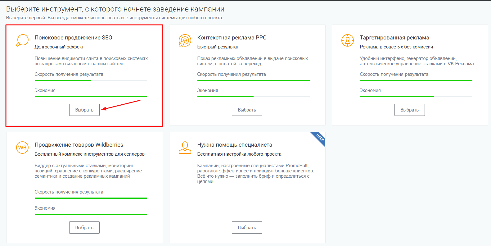 Зарегистрируйтесь или авторизуйтесь в PromoPult и выберите модуль «Поисковое продвижение SEO».