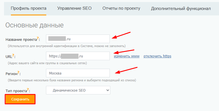 Назовите проект, введите URL адрес сайта и выберите регион продвижения.