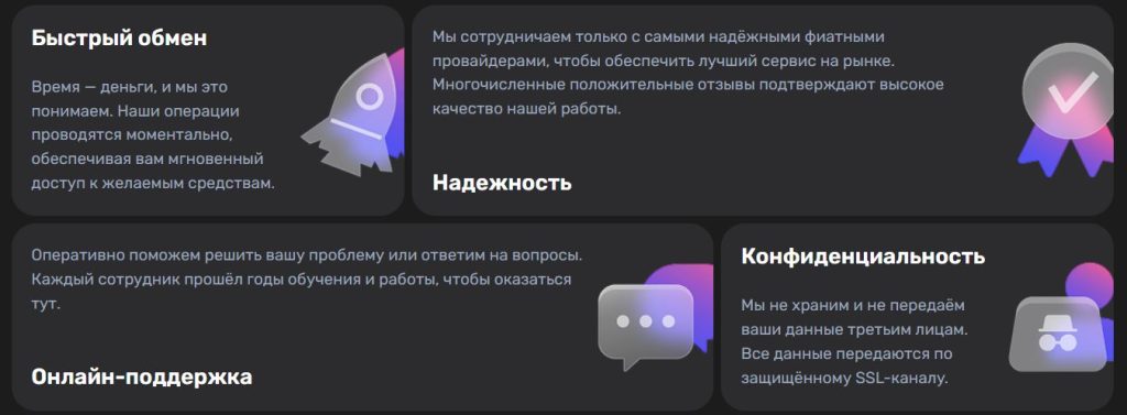 Alfin.pro радует скоростью проведения операций. Большинство обменов происходит в течение нескольких минут — а в некоторых случаях даже моментально. Это особенно важно в условиях высокой волатильности криптовалютного рынка, когда промедление в несколько минут может привести к потере средств из-за колебания курса.