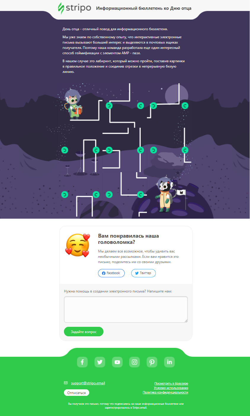 Геймификация – must-have email-рассылок. АМР позволяет сделать игру еще более интересной и захватывающей. Предложите получателям покрутить колесо фортуны и выиграть скидку или собрать пазл и получить промокод. Такие письма максимально вовлекают, развивают лояльность к бренду, и подписчики их действительно ждут. Ведь вы не просто присылаете очередную акцию, а предлагаете интересное взаимодействие с рассылкой. Здесь мы собрали самые интересные кейсы по геймификации.