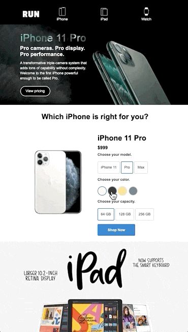 Селектор – дает возможность получателю прямо в письме выбрать параметры: цвет, размер и прочую комплектацию товара.