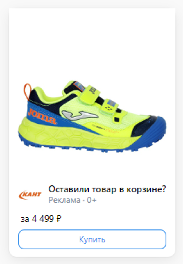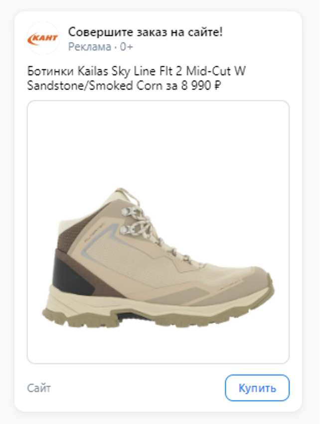 Объявления в кампаниях с каталогом товаров создаются автоматически в двух вариантах: товарный баннер с одним товаром или товарная карусель. Каждая карточка товара вела на страницу товара на сайте КАНТ.