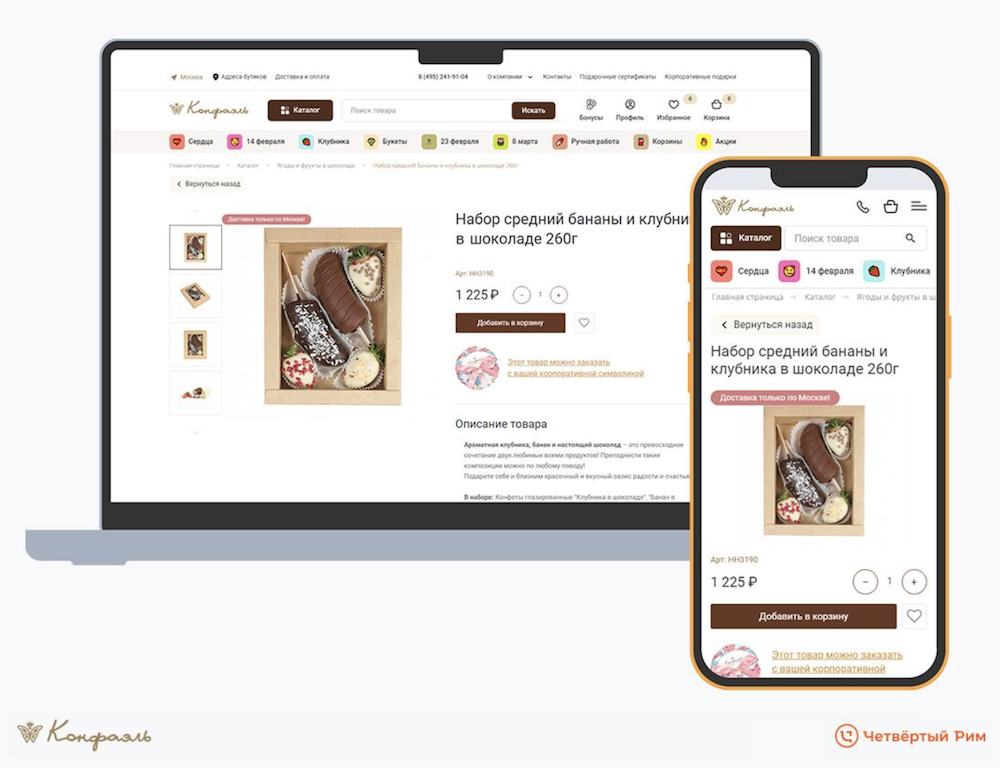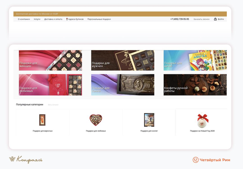 «Конфаэль» — производитель премиального шоколада, специализируется на создании оригинальных шоколадных подарков. В бизнесе два сегмента: индивидуальные и корпоративные продажи — у каждого отдельный сайт. Ценовая категория выше среднего.