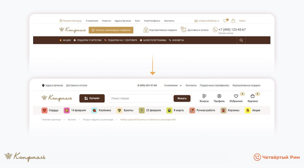 Проблема в том, что дизайн никак нельзя было назвать удачным: сайт выглядел тусклым и обезличенным, не вызывал ассоциаций ни с шоколадом, ни с подарками, непонятная навигация сбивала с пользовательского пути. В команде клиента с этим согласились, поэтому поддержали предложение его улучшить — конечно же поэтапно. Поэтому мы наметили первые шаги. Об этом расскажем на следующих этапах.