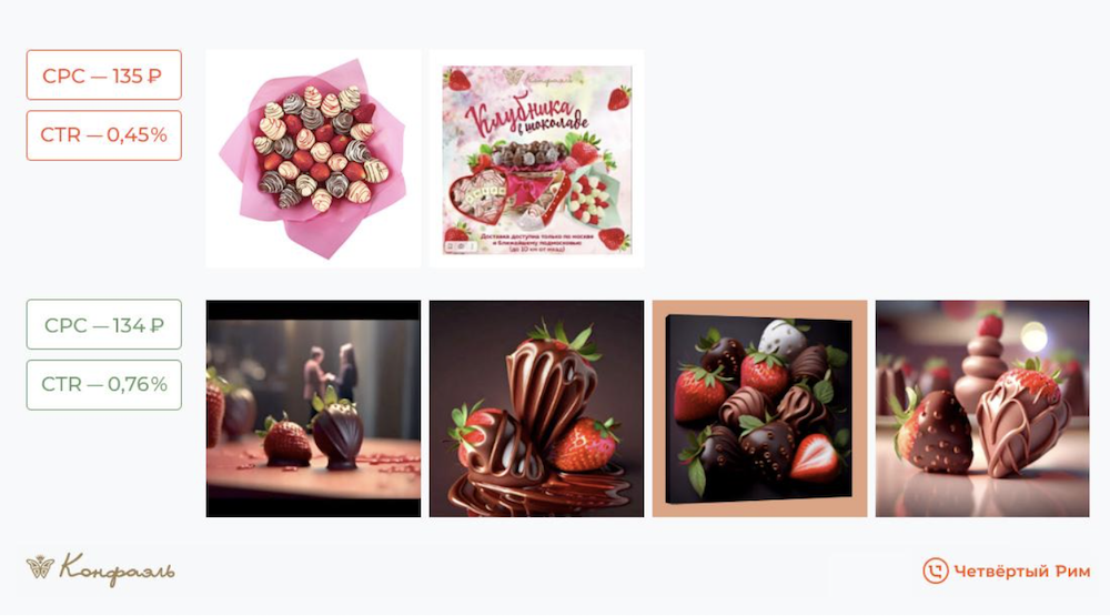 В 2023 году усилили взятый курс на оптимизацию расходов, на этот раз взяв в помощники искусственный интеллект. Нейросети подсказывают идеи для рекламы и генерируют визуальные креативы за считаные минуты. Используя их с умом, можно делать новые запуски быстрее и дешевле. Еще и улучшить эффективность, например, при отсутствии бюджета на дорогую фотосъемку. Помимо экономии средств на фотосъемке, по некоторым кампаниям мы получаем CTR выше на 30%. Однако, это касается не всех объявлений, поэтому мы аккуратно внедряем новые инструменты, чтобы не просесть в заказах.