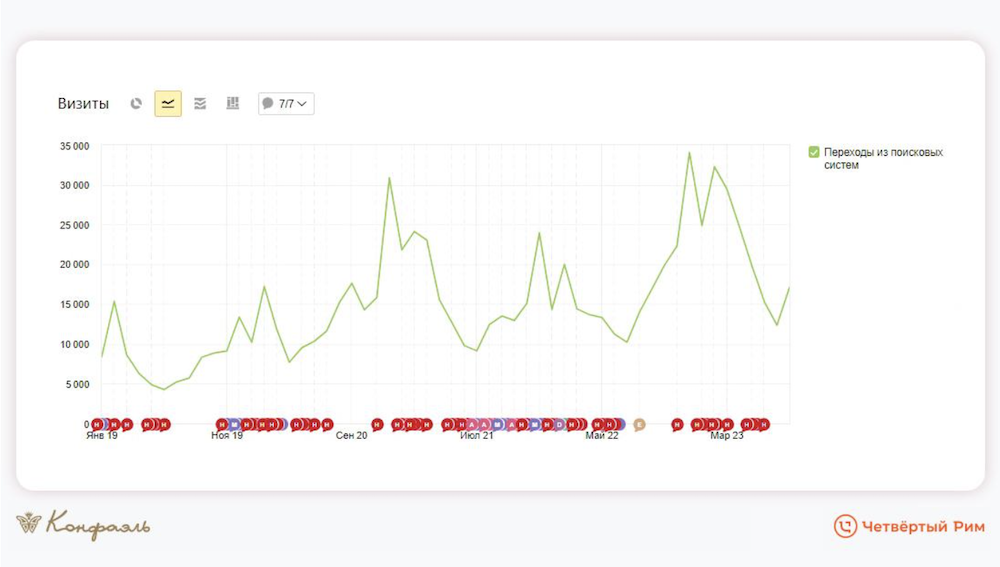 Со стороны SEO мы продолжаем наращивать целевой трафик, работая над расширением структуры, увеличением качественной ссылочной массы и улучшением посадочных страниц.