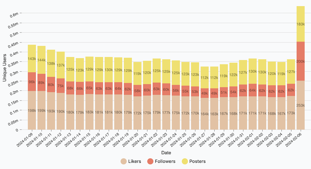 Согласно статистике, количество уникальных пользователей Bluesky почти удвоилось с понедельника на вторник – в среднем создавалось 8,5 новых аккаунтов в секунду. Всего за последние 24 часа пользователями платформы было создано более 2 млн сообщений: